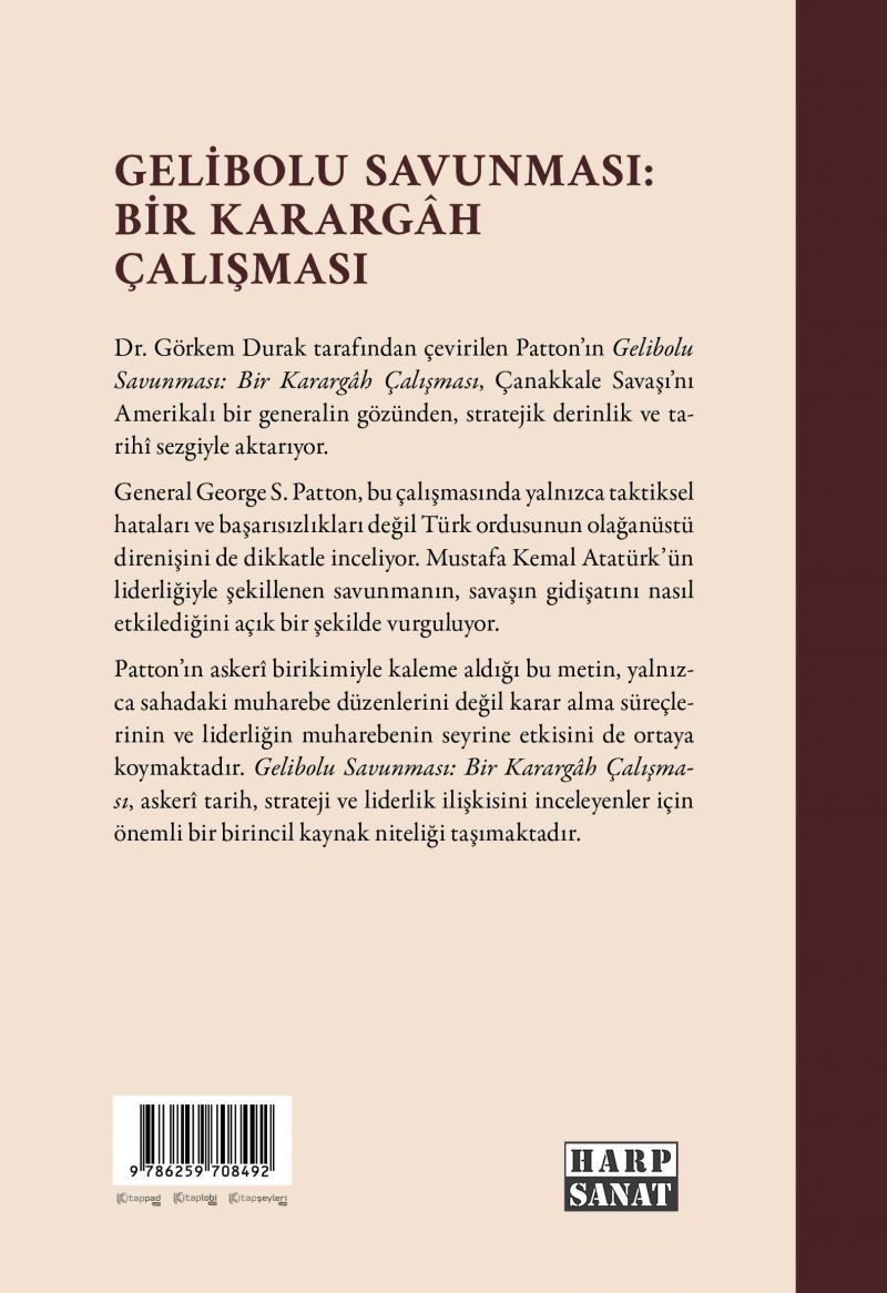 Patton’ın askerî birikimiyle kaleme aldığı bu metin, yalnızca sahadaki muharebe düzenlerini değil karar alma süreçlerinin ve liderliğin muharebenin seyrine etkisini de ortaya koymaktadır. Gelibolu Savunması: Bir Karargâh Çalışması, askerî tarih, strateji ve liderlik ilişkisini inceleyenler için önemli bir birincil kaynak niteliği taşımaktadır.