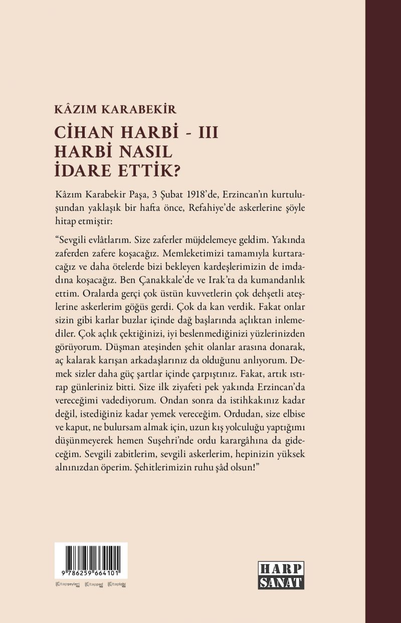 Sevgili evlâtlarım. Size zaferler müjdelemeye geldim. Yakında zaferden zafere koşacağız. Memleketimizi tamamıyla kurtaracağız ve daha ötelerde bizi bekleyen kardeşlerimizin de imdadına koşacağız. Ben Çanakkale’de ve Irak’ta da kumandanlık ettim. Oralarda gerçi çok üstün kuvvetlerin çok dehşetli ateşlerine askerlerim göğüs gerdi. Çok da kan verdik. Fakat onlar sizin gibi karlar buzlar içinde dağ başlarında açlıktan inlemediler. Çok açlık çektiğinizi, iyi beslenmediğinizi yüzlerinizden görüyorum. Düşman ateşinden şehit olanlar arasına donarak, aç kalarak karışan arkadaşlarınız da olduğunu anlıyorum. Demek sizler daha güç şartlar içinde çarpıştınız. Fakat, artık ıstırap günleriniz bitti. Size ilk ziyafeti pek yakında Erzincan’da vereceğimi vadediyorum. Ondan sonra da istihkakınız kadar değil, istediğiniz kadar yemek vereceğim. Ordudan, size elbise ve kaput, ne bulursam almak için, uzun kış yolculuğu yaptığımı düşünmeyerek hemen Suşehri’nde ordu karargâhına da gideceğim. Sevgili zabitlerim, sevgili askerlerim, hepinizin yüksek alnınızdan öperim. Şehitlerimizin ruhu şâd olsun! [I’inci Kafkas Kolordusu Kumandanı Kâzım Karabekir Paşa’nın 3 Şubat 1918 günü Refahiye’de kolordusunu teftişi esnasında askerlere nutku, bu konuşması, Erzincan’ın kurtuluşundan bir hafta kadar önce yapılmıştır.]