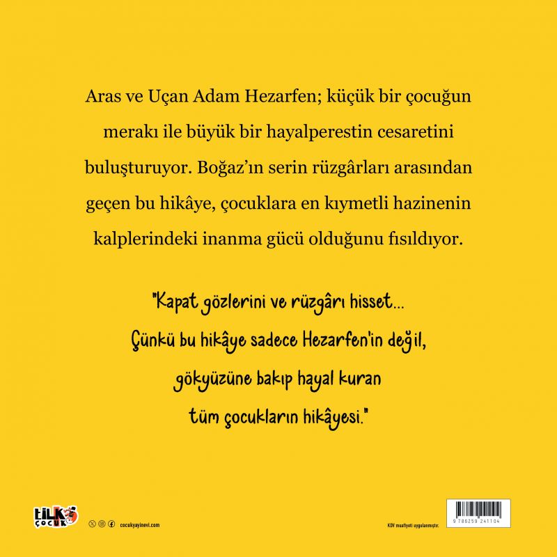 "Kapat gözlerini ve rüzgârı hisset... Çünkü bu hikâye sadece Hezarfen’in değil, gökyüzüne bakıp hayal kuran tüm çocukların hikâyesi."
