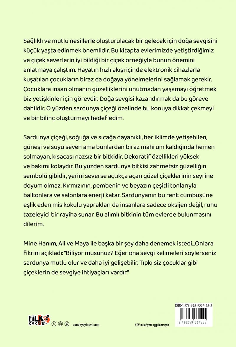 Sağlıklı ve mutlu nesillerle oluşturulacak bir gelecek için doğa sevgisini küçük yaşta edinmek önemlidir. Bu kitapta evlerimizde yetiştirdiğimiz ve çiçek severlerin iyi bildiği bir çiçek örneğiyle bunun önemini anlatmaya çalıştım. Hayatın hızlı akışı içinde elektronik cihazlarla kuşatılan çocukların biraz da doğaya yönelmelerini sağlamak gerekir. Çocuklara insan olmanın güzelliklerini unutmadan yaşamayı öğretmek biz yetişkinler için görevdir. Doğa sevgisi kazandırmak da bu göreve dahildir. O yüzden sardunya çiçeği özelinde bu konuya dikkat çekmeyi ve bir bilinç oluşturmayı hedefledim.