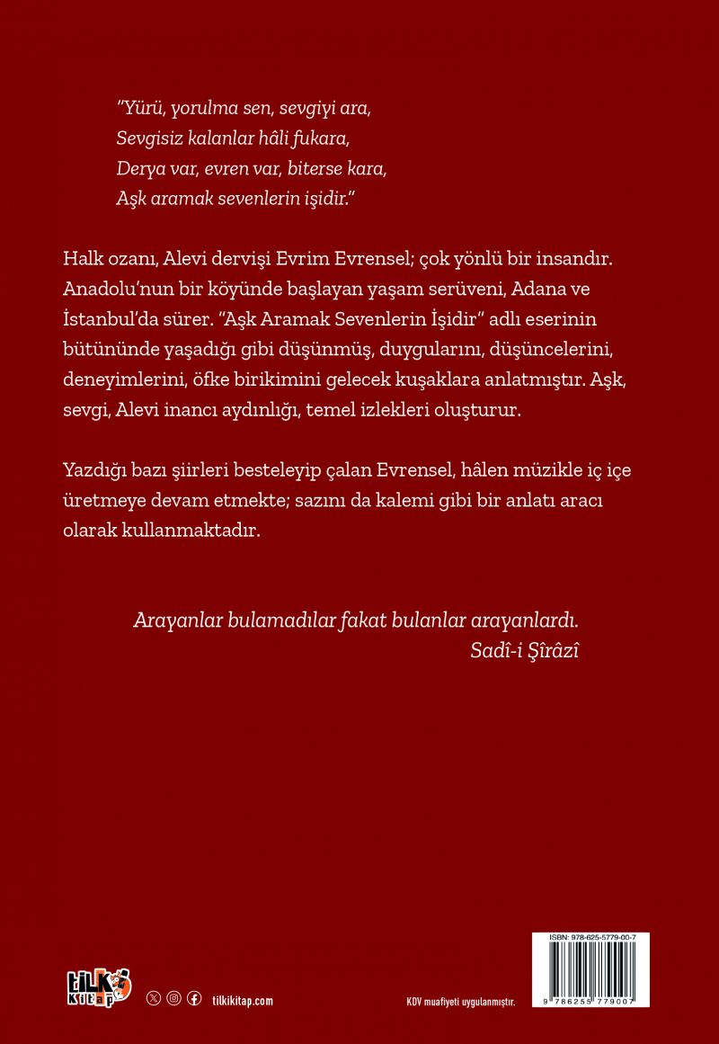 Halk ozanı, Alevi dervişi Evrim Evrensel; çok yönlü bir insandır. Anadolu’nun bir köyünde başlayan yaşam serüveni, Adana ve İstanbul’da sürer. “Aşk Aramak Sevenlerin İşidir” adlı eserinin bütününde yaşadığı gibi düşünmüş, duygularını, düşüncelerini, deneyimlerini, öfke birikimini gelecek kuşaklara anlatmıştır. Aşk, sevgi, Alevi inancı aydınlığı, temel izlekleri oluşturur.