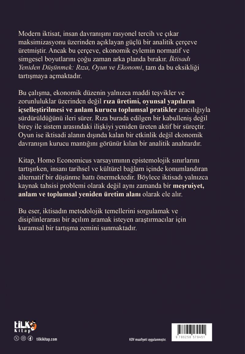 Modern iktisat, insan davranışını rasyonel tercih ve çıkar maksimizasyonu üzerinden açıklayan güçlü bir analitik çerçeve üretmiştir. Ancak bu çerçeve, ekonomik eylemin normatif ve simgesel boyutlarını çoğu zaman arka planda bırakır. İktisadı Yeniden Düşünmek: Rıza, Oyun ve Ekonomi, tam da bu eksikliği tartışmaya açmaktadır.