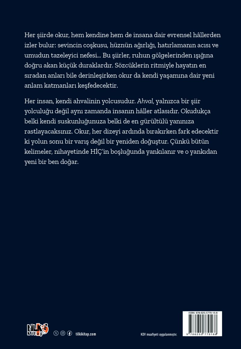 Her insan kendi ahvalinin yolcusudur.Ahval yalnızca bir şiir yolculuğu değil aynı zamanda insanın hâller atlasıdır.Okudukça belki kendi suskunluğunuza belki de en gürültülü yanınıza rastlayacaksınız.Okur, her düzeyi ardında bırakırken fark edecektir ki yolun sonu bir varış değil bir yeniden doğuştur.Çünkü bütün kelimeler, nihayetinde HİÇ'in boşluğunda yankılanır ve o yankıdan yeni bir ben doğar.