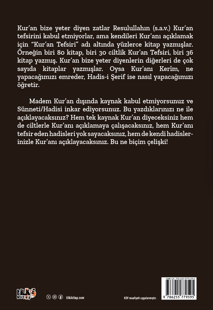 Madem Kur’an dışında kaynak kabul etmiyorsunuz ve Sünneti/Hadisi inkar ediyorsunuz. Bu yazdıklarınızı ne ile açıklayacaksınız? Hem tek kaynak Kur’an diyeceksiniz hem de ciltlerle Kur’anı açıklamaya çalışacaksınız, hem Kur’anı tefsir eden hadisleri yok sayacaksınız, hem de kendi hadislerinizle Kur’anı açıklayacaksınız. Bu ne biçim çelişki!