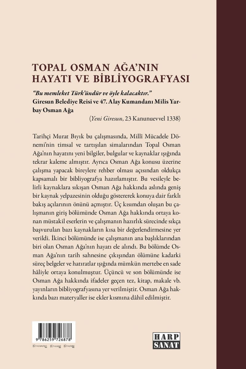 Tarihçi Murat Bıyık bu çalışmasında, Millî Mücadele Dönemi’nin timsal ve tartışılan simalarından Topal Osman Ağa’nın hayatını yeni bilgiler, bulgular ve kaynaklar ışığında tekrar kaleme almıştır. Ayrıca Osman Ağa konusu üzerine çalışma yapacak bireylere rehber olması açısından oldukça kapsamalı bir bibliyografya hazırlamıştır. Bu vesileyle belirli kaynaklara sıkışan Osman Ağa hakkında aslında geniş bir kaynak yelpazesinin olduğu göstererek, konuya dair farklı bakış açılarının önünü açmıştır. Üç kısımdan oluşan bu çalışmanın giriş bölümünde Osman Ağa hakkında ortaya konan müstakil eserlerin ve çalışmanın hazırlık sürecinde sıkça başvurulan bazı kaynakların kısa bir değerlendirmesine yer verildi. İkinci bölümünde ise çalışmanın ana başlıklarından biri olan Osman Ağa’nın hayatını ele alındı. Bu bölümde Osman Ağa’nın tarih sahnesine çıkışından, ölümüne kadarki süreç belgeler ve hatıratlar ışığında mümkün mertebe en sade haliyle ortaya konulmuştur. Üçüncü ve son bölümünde ise Osman Ağa hakkında ifadeler geçen tez, kitap, makale vb. yayınların bibliyografyasına yer verilmiştir. Osman Ağa hakkında bazı materyaller ise ekler kısmına dahil edilmiştir.
