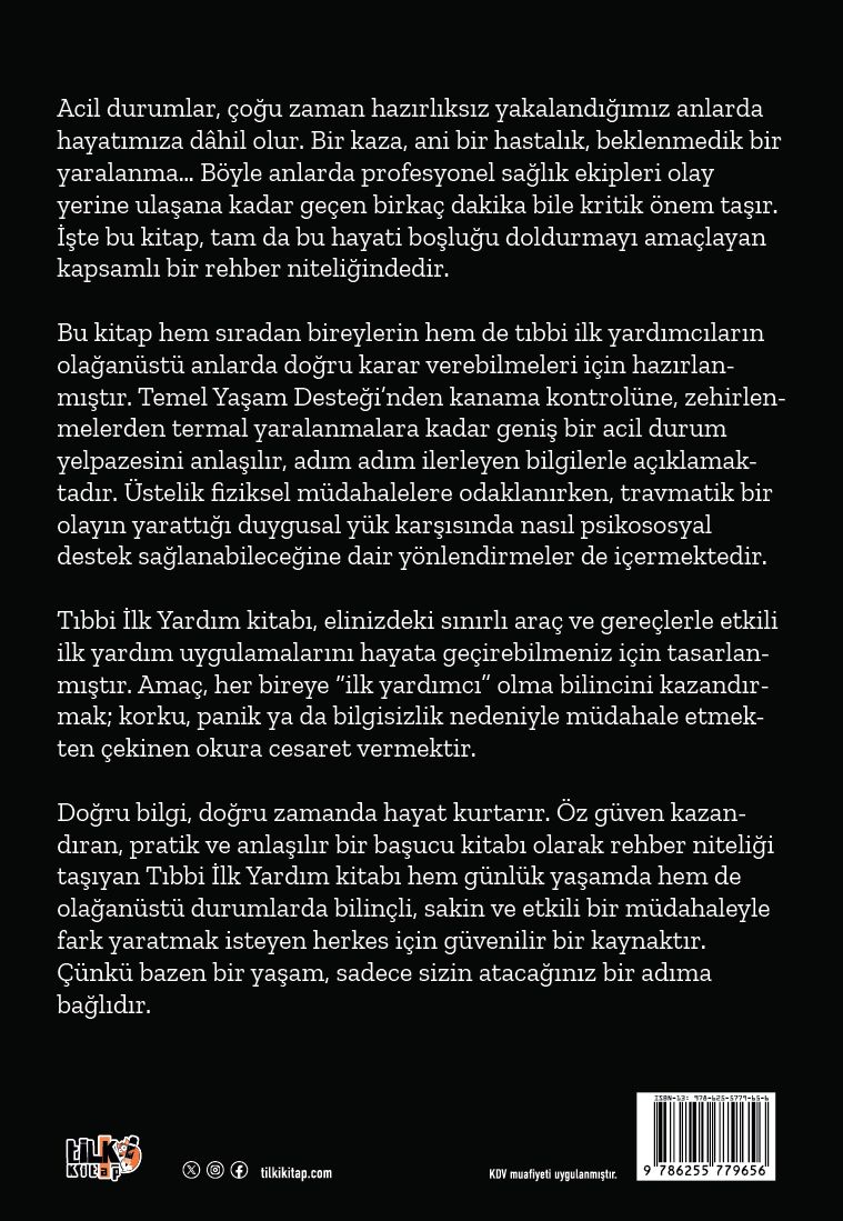 Doğru bilgi, doğru zamanda hayat kurtarır. Öz güven kazandıran, pratik ve anlaşılır bir başucu kitabı olarak rehber niteliği taşıyan Tıbbi İlk Yardım kitabı hem günlük yaşamda hem de olağanüstü durumlarda bilinçli, sakin ve etkili bir müdahaleyle fark yaratmak isteyen herkes için güvenilir bir kaynaktır. Çünkü bazen bir yaşam, sadece sizin atacağınız bir adıma bağlıdır.