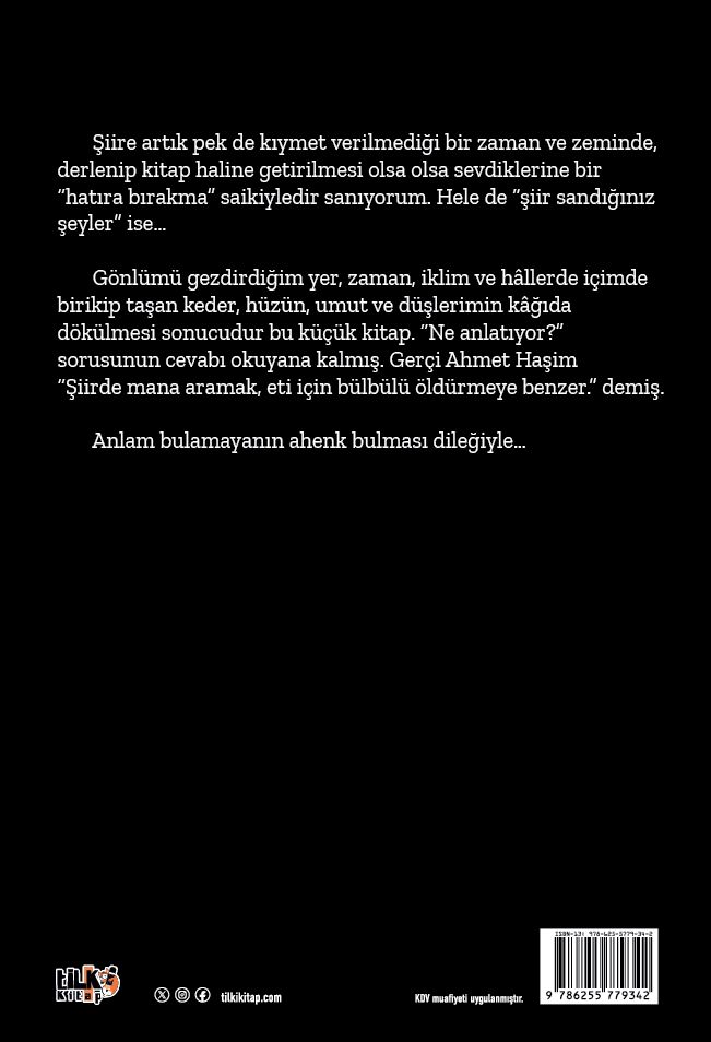 Şiire artık pek de kıymet verilmediği bir zaman ve zeminde, derlenip kitap haline getirilmesi olsa olsa sevdiklerine bir “hatıra bırakma” saikiyledir sanıyorum. Hele de “şiir sandığınız şeyler” ise…
